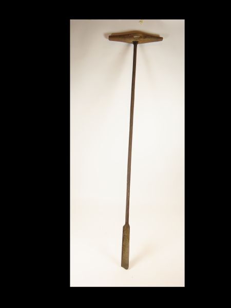 Lange metalen schep met dwars op stok een houten handgreep. Het schepgedeelte is licht gebogen.