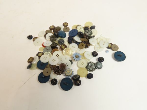 Zwart blik met scharnierend deksel, met afbeelding van kemphaantjes . Het blik bevat een verzameling knopen.