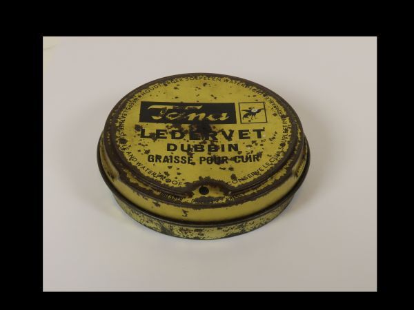 goudkleurig rond blik, met los deksel en zwarte tekst