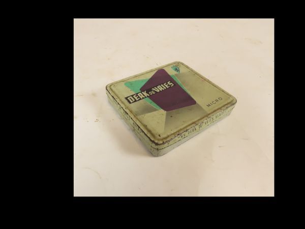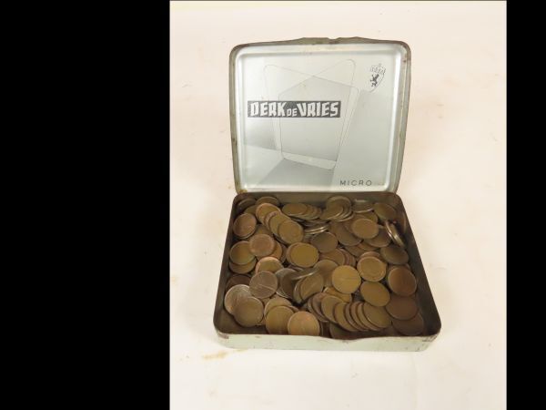 Sigarenblik met scharnierend deksel, opschrift DERK DE VRIES/MICRO. Het blik bevat een groot aantal koperen centen en stuivers, alsmede 25-cents stukken en 1 Duitse munt