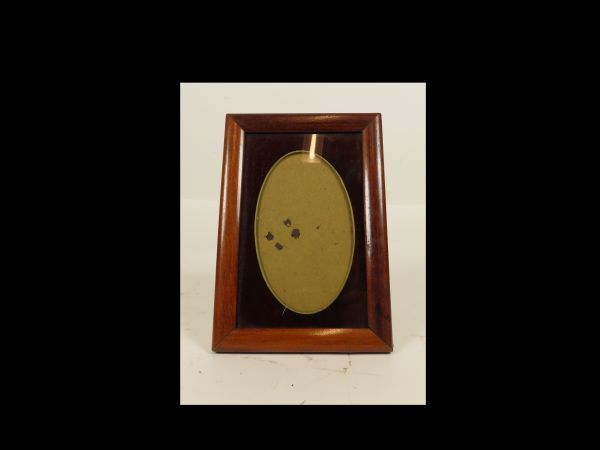 Lijst, zijnde een fotolijst, bruin kader en zwarte achtergrond met een ovale uitsparing. De achterzijde is zwart met uit te vouwen standaard.