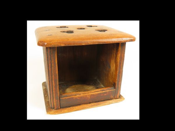Rechthoekige houten stoof, bovenblad versierd met vier uitgesneden driepassen en een cirkel.
