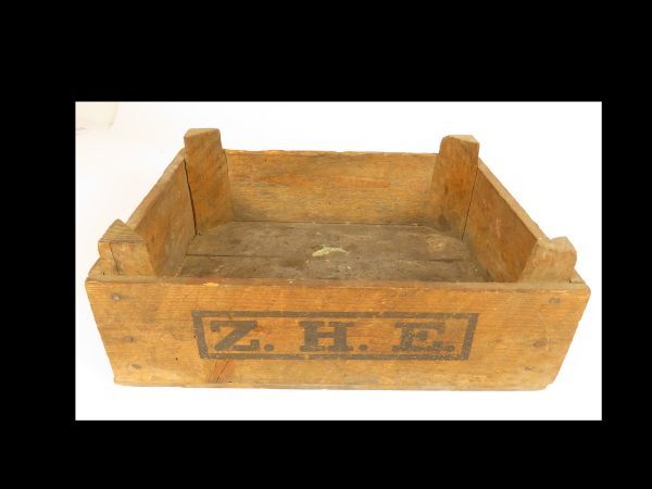 Houten kistje van de veiling Zuid Hollandse Eilanden met drie bodenplankjes en ingefreesde handgrepen aan de korte zijkanten.