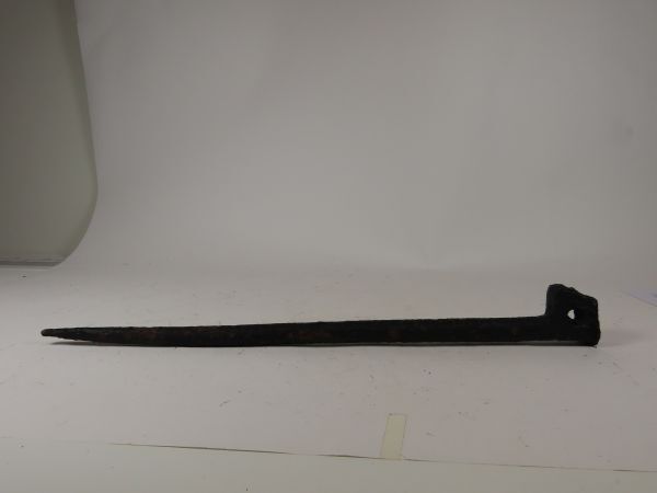 Ronde aan de onderzijde taps toelopende ijzeren pin die aan de bovenzijde is uitgesmeed in een platte trapeziumvorm waarin een gat is aangebracht. Vermoedelijk betreft het hier een grondpin of -pen voor het met een touw vastzetten van een geit of ander dier.