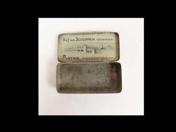 rechthoekig;scharnierend oversluitdeksel,met afbeelding van een panter op deksel en op de binnekant van het deksel een afbeelding van de Panter sigaren-fabriek van H&J Schuppen Veenendaal