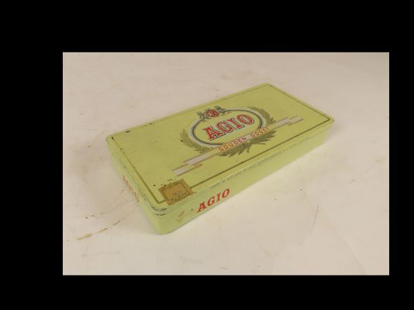 Langwerpig rechthoekig met scharnierend deksel; vouwrand doos,steunvoor. Vervaardiging:gefelste langsnaad en bodem;naaldscharnier. Decoratie:Lichtgele ondergrond met goudkleurige en rood/zwarte bedrukking:merknaam in ovaal met wapenschild met toren,sleutel en twee leeuwen en bladerkrans;
