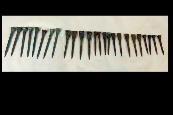 Verzameling stalen hoefnagels in diverse soorten en maten.