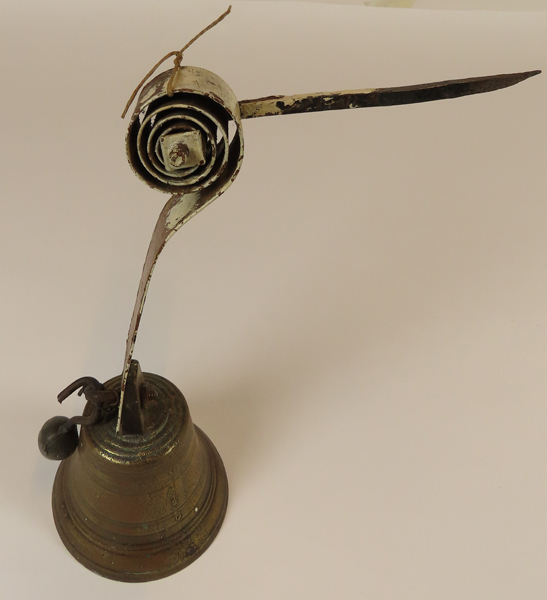 Koperen trekbel met afneembare metalen klepel. De bel is met een schroefoog en een moer bevestigd aan een gedeeltelijk opgerolde bandveer. In het hart van de opgerolde bandveer is een grote vierkante haakse nagel gemonteerd waarmee de bel in een muur of balk kan worden bevestigd. De nagel heeft een draadeind waarop de bandveer met ...