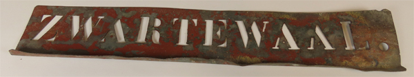 Metalen plaat, een zogeheten sjabloon of mal, waarvan aan de onderzijde een smalle strook naar binnen is omgeslagen. In het sjabloon is de naam ZWARTEWAAL. (met een punt erachter) uitgestanst.