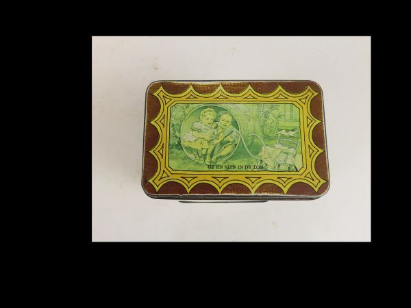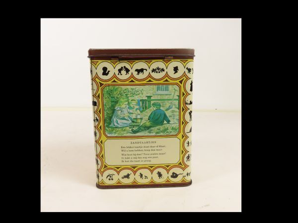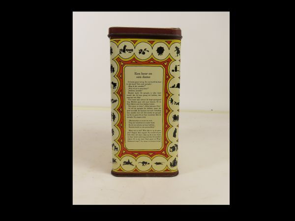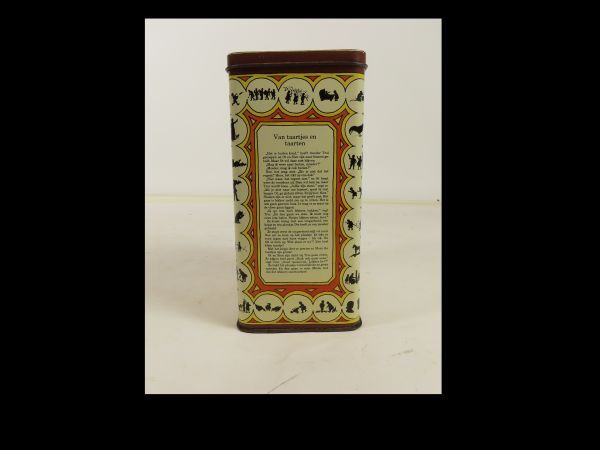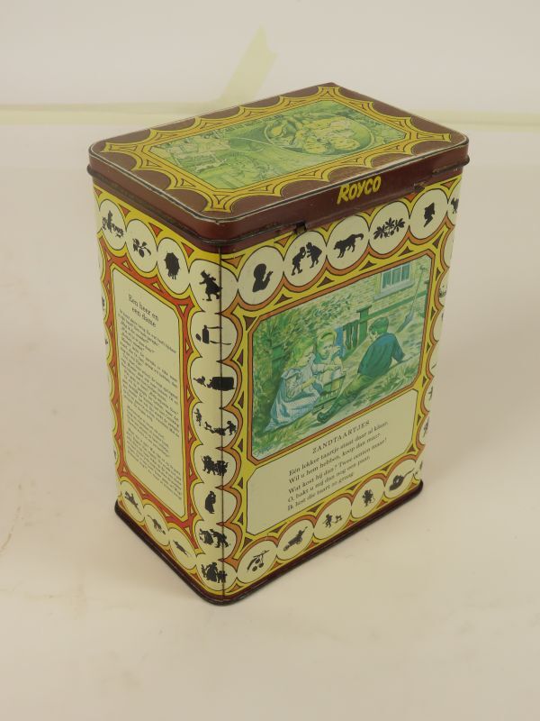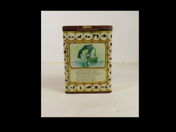 Hoog rechthoekig blik met los deksel. Rechthoekige blik voor Royco soep met als decoratieve afbeeldingen van Ot en Sien door C. Jetses; daaronder de gedichtjes getiteld: Zandtaartjes, Onder moeders paraplu, Royco. Op de zijkanten van de blikken nog twee verhaaltjes : Een heer en een dame, Van taartjes en taarten.