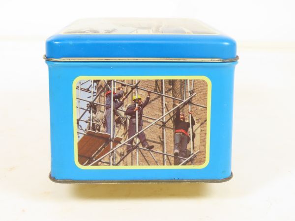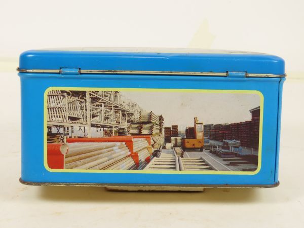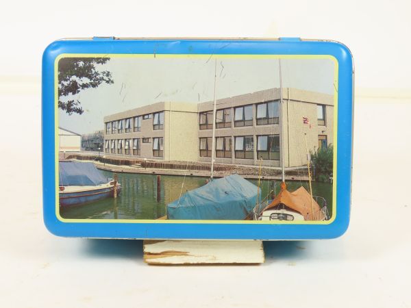 Langwerpig koekblik met scharnierend deksel ter gelegenheid van de opening gebouw Spreewenberg beheer in oktober 1983. Het blik is gedecoreerd met foto's van het gebouw.