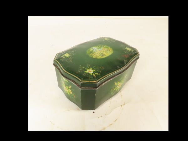 Langwerpig, elke zijde gegolfd. Lange smalle strip metaal op hoeken. Overschuivend iets bol deksel. Pootjes in de vorm van draaibare kogeltjes. Donkergroene craquelé ondergrond. In het midden van elke zijde bloemboeket. Deze bloemen ook op de vier hoeken van het deksel. Midden op deksel schildering van bebouwing, kerk op achtergrond, man en vrouw te paard ...