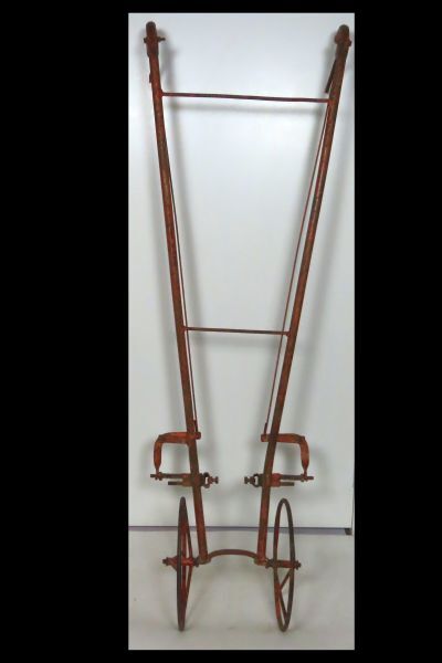 Oranjekleurig schoffelapparaat voor het losmaken van onkruid bij opkomend plantgoed in rijen. Deze schoffelmachine met twee wielen is geschikt voor het voortduwen van twee schoffels, die met behulp van een knijp- en veermechanisme aan de handvaten in de breedte kunnen worden bewogen.