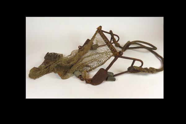 Klein visnet bevestigd aan een zware ijzeren beugel waaraan zich twee ijzeren gewichten bevinden. De beugel is extra verzwaard met twee loden ringen. Aan de netkant zit een zogeheten wekketting die ook is verzwaard met een loden ring. Het net wordt voortgesleept met een touw dat aan twee zijden aan de beugel is bevestigd. De ...