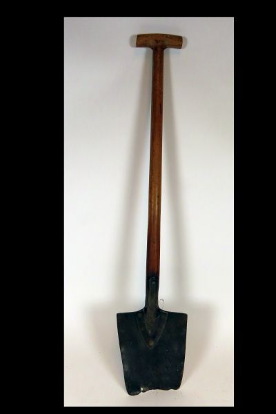 Metalen spade met metalen steelhouder, houten steel en handvat. Steelhouder is met 5 nagels aan het blad bevestigd. Trapeziumvormig blad.