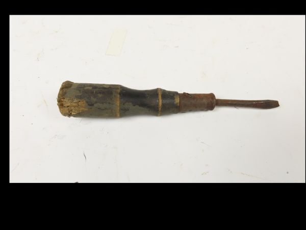 Metalen schroevendraaier met houten handvat.