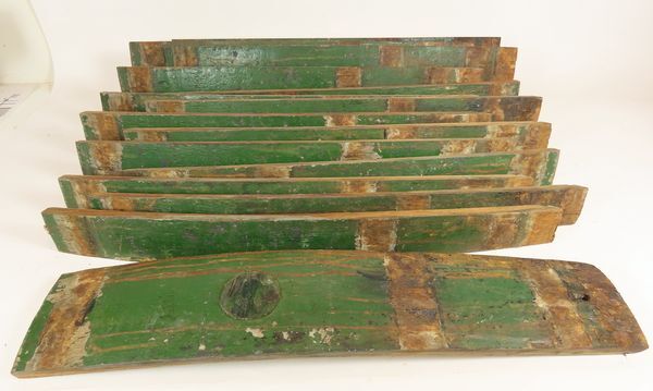 Verzameling van 22 houten duigen van verschillende breedtes en een deksel (of bodem) in drie delen (totaal 25 onderdelen). Alle onderdelen zijn aan de buitenzijde groen geschilderd. Een van de duigen bevat een houten stop met een stukje jute als afsluiting. Samen vormen ze vermoedelijk een (deel van een) vat; de bodem (of deksel) en ...