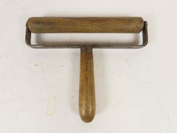 Houten roller, gevat in metalen beugel op houten steel. Op de metalen beugel is een uitstekend pennetje bevestigd.
