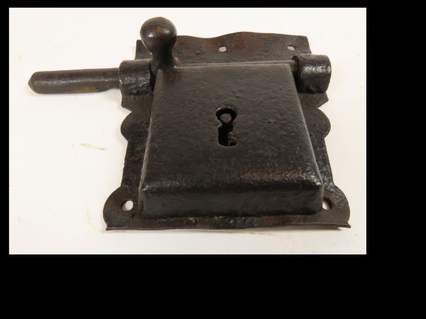 Metalen slot met schuif en sleutelgat. Geen sleutel aanwezig.