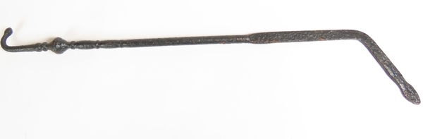 Metalen (kachel)pook met haak en gebogen plat eind. Bij de haak zit een verdikking.