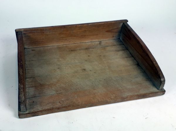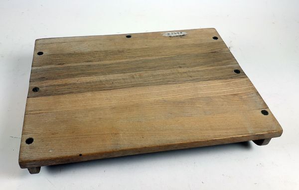 Houten snijplank met aan drie zijden een opstaande rand. De randen aan de korte zijden zijn schuin afgerond. Mogelijk gebruikt voor het snijden van brood en/of groenten.