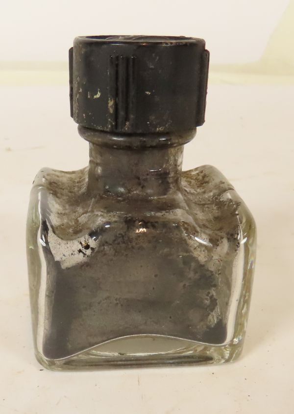 Glazen bijna vierkant inktpotje van de firma Talens met bovenop twee sleufjes voor het opleggen van pennen, afsluitbaar met overvallend bakelieten draaidopje.