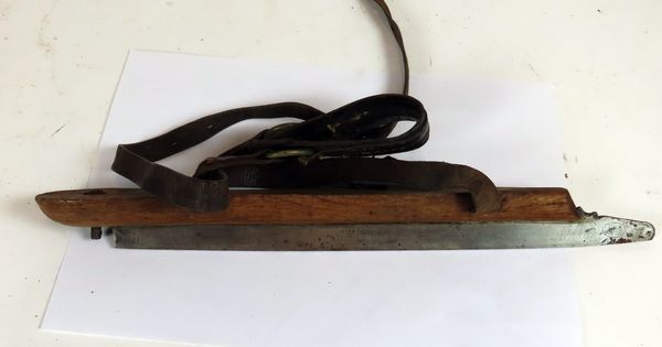 Houten schaats van het type Friese doorloper, met leren wreef- en hielriempje.
