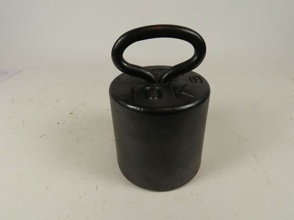 Rond metalen gewicht van 10 kg met aan de bovenzijde een oog en aan de onderzijde een ronde uitholling.