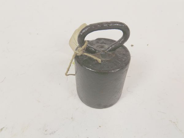 Rond metalen gewicht van 1 kg met aan de bovenzijde een oog en aan de onderzijde een ronde uitholling.