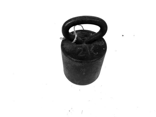 Rond metalen gewicht van 2 kg met aan de bovenzijde een oog en aan de onderzijde een ronde uitholling.