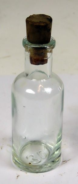 Rond glazen flesje met kurken stopje en maataanduiding 30 in bodem.