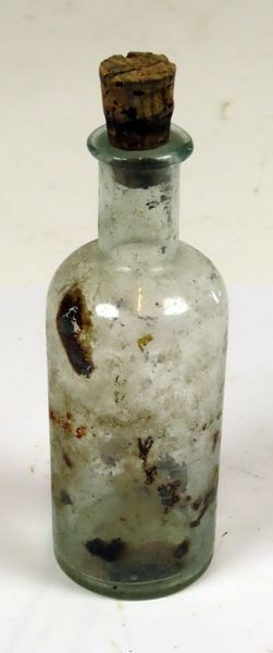 Rond glazen flesje met kurken stopje en maataanduiding 75 in bodem.