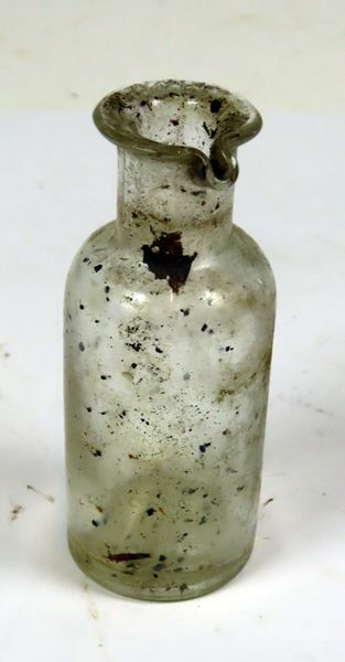 Rond glazen flesje met tuitvormige schenkrand en maataanduiding 20 in bodem. Stopje onbreekt.