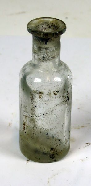 Rond glazen flesje met maataanduiding 15 in bodem. Stopje onbreekt.
