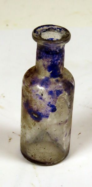 Rond glazen flesje met maataanduiding 15 in bodem. Stopje onbreekt.