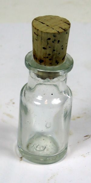 Rond glazen flesje met kurken stopje en maataanduiding 5 in bodem.