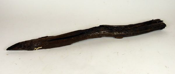 Gedeelte van een houten steunpaal, gevonden in de Ondernemingspolder te Zwartewaal, en (vermoedelijk) gebruikt voor de beschoeiing van de Maasdijk aldaar. Volgens de heer C. Schouwenburg - oud-medewerker Historische Werkgroep Zwartewaal - betreft het hier een stuk van een paal zoals gebruikt voor het ondersteunen van een dijkversterking met Vilvoordse zandsteen.