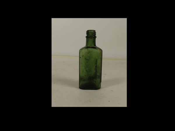 Rechthoekig flesje van groen glas. Schroefdop ontbreekt.