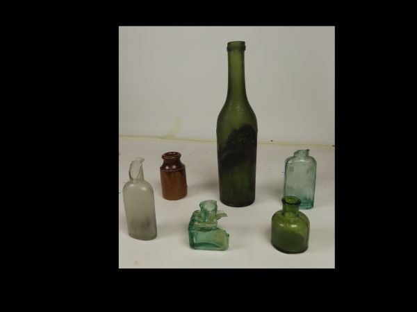 Glaswerk, diverse: één grote fles van groen glas, een inktpotje en vier kleine flesjes. Eën flesje dateert vlgs inliggend kaartje van voor 1800. Daarnaast een aardewerken potje.