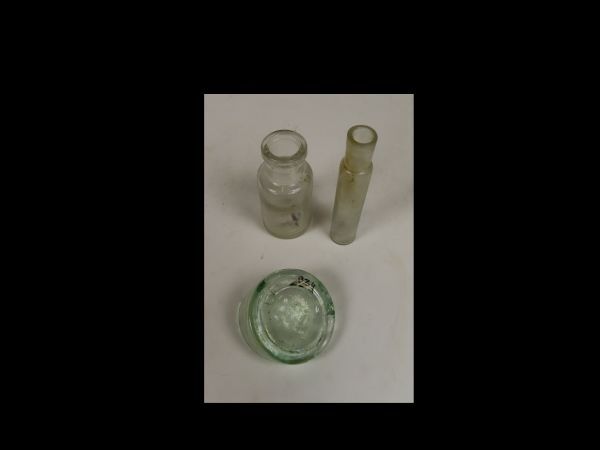 Glaswerk, zijnde een witglazen potje, gemerkt aan onderzijde 30 met daaronder 399, een bodem van een lichtgroen glazen bakje, gemerkt (onderzijde) 200 en een witglazen flesje, aan de zijde gemerkt GKT.