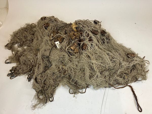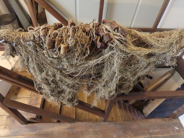 Staand visnet voorzien van kurken drijvers en met loodjes verzwaard.