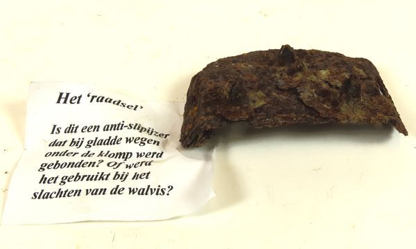 Metalen plaat met omgebogen zijkanten en aan de 1 zijde 3 uitstekende punten. In de omgebogen zijkanten zit een dun, langwerpig gat.