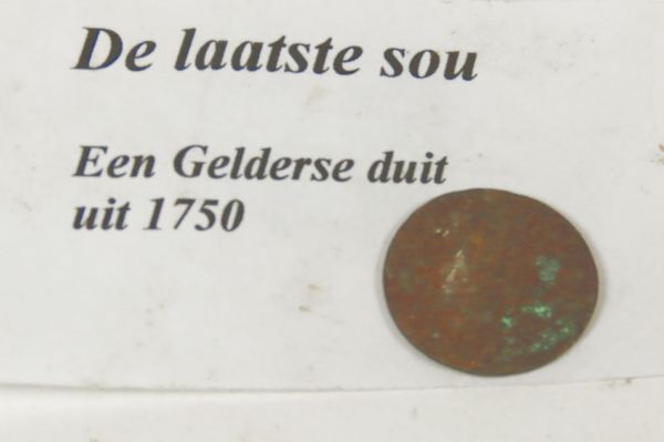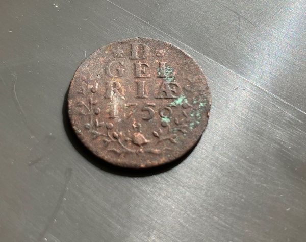 Duit uit de provincie Gelderland. De munt heeft op de voorzijde het opschrift .D. Gelriae (voluit Ducatus Gelria - betekent Hertogdom Gelderland) en het jaartal 1756. En op de keerzijde staat het wapen van Gelderland, een gekroond wapen met de Leeuwen Gelre en Gulik, en het opschrift: In Deo Est Spes Nostra (Onze hoop in ...