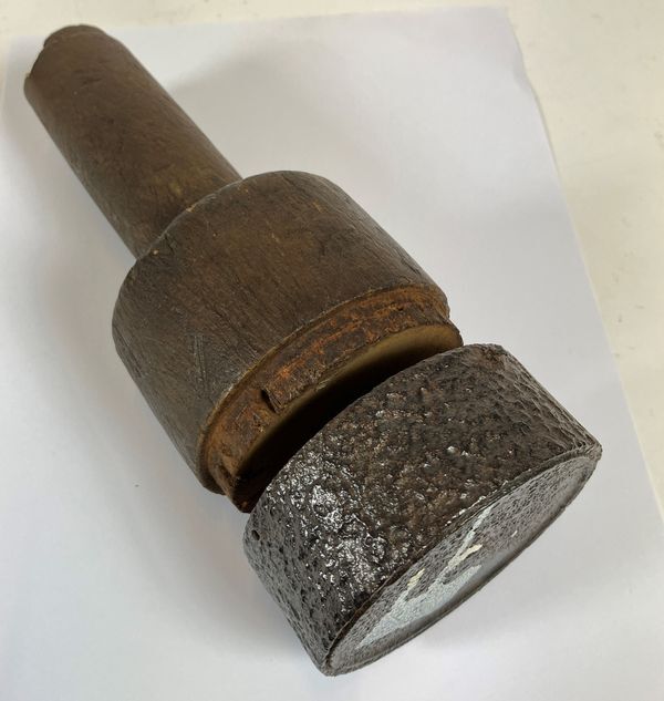 Bondelblikstamper. Gereedschap in de vorm van een handgreep met aan de uiteinde een slagring en door het midden een slagijzer met een veer. Hiermee wordt het bondelblik met een hamer met een klap vast geslagen over het bondelgat ofwel bomgat, als soort verzegeling van een houten vat.