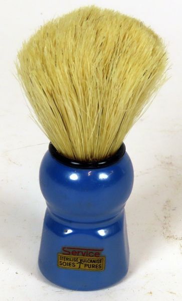 Lichtgeel kleurige scheerkwast met blauw handvat van het merk Service. Bovenop het handvat bevindt zich een zwarte metalen ring.