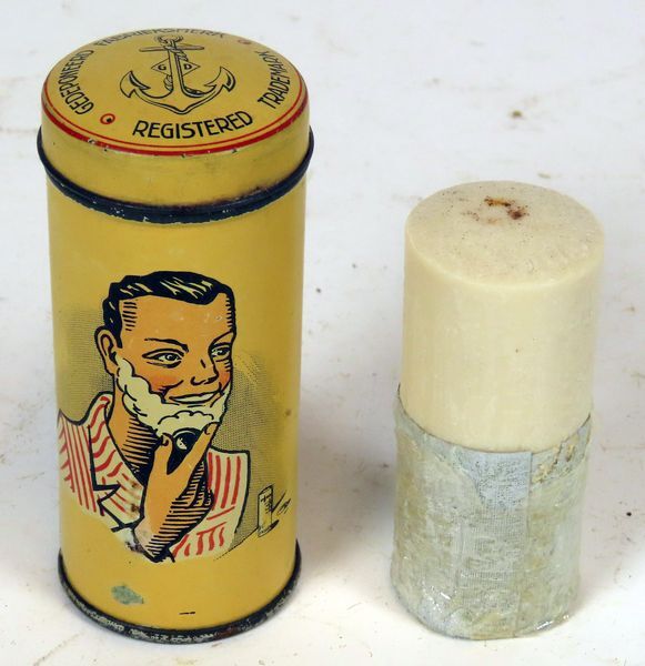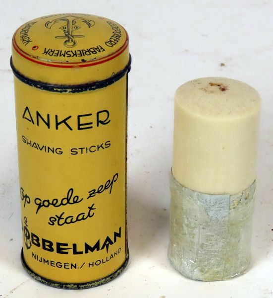 Okergeel busje van de firma Dobbelman uit Nijmegen met oversluitend deksel. De rand van het deksel is voorzien van een rode bies. In het busje een cilindervormig staafje scheerzeep van het merk Anker. De teksten op het busje zijn in zwart gedrukt.