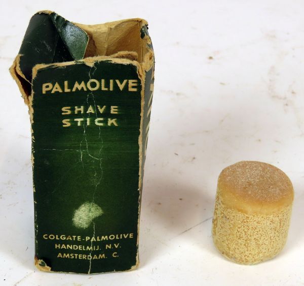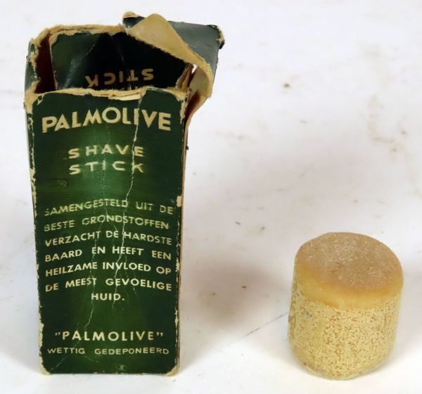 Rechthoekig groen doosje van de firma Palmolive, op alle zijden voorzien van teksten in diapositief. In het doosje een stukje scheerzeep.