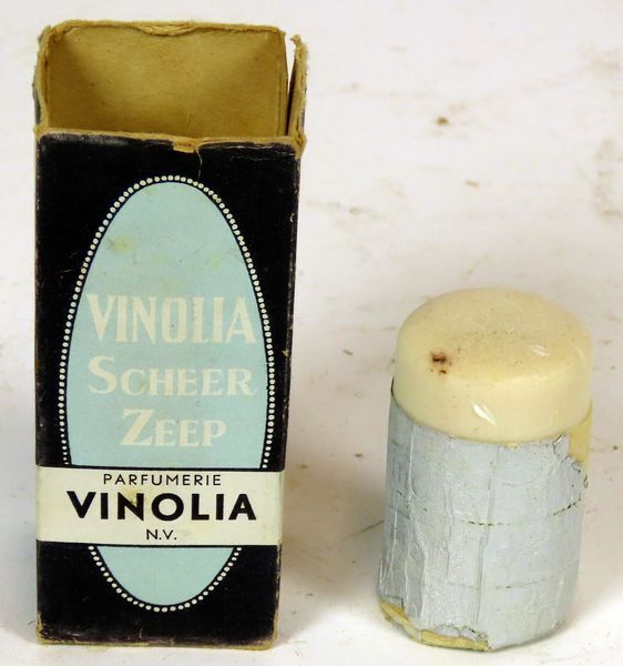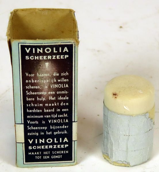 Rechthoekig donkerblauw doosje van het merk Vinolia, op alle zijden voorzien van teksten in zwart en diapositief. In het doosje een stukje scheerzeep.