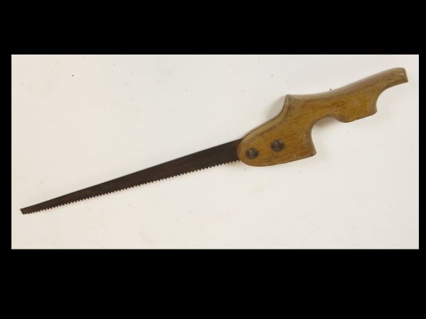 Smalle zaag met houten handvat. Het blad is met twee nagels aan het hout vastgezet.