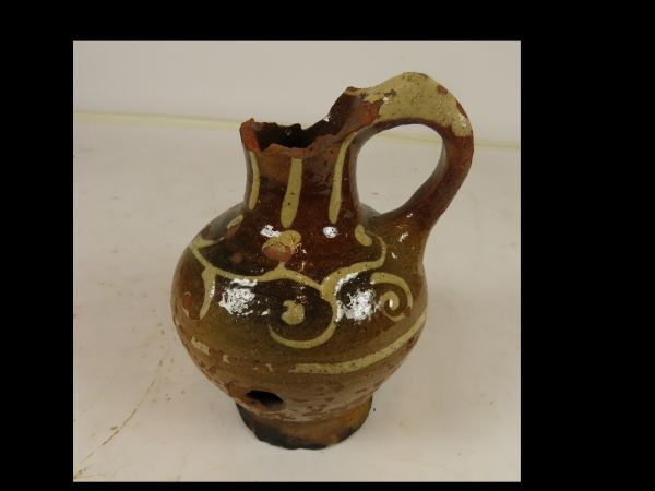 Bolvormige, bruinaardewerken kruik met verticaal oor. Gele versiering rondom, op hals en oor. 2 inliggende kaartjes: 1) Vindplaats: Julianalaan voormalige timmerloods de Kievit (achter gemeentehuis). 2) Kruikje 18e eeuw? gevonden bij de sloop van de loods van de drankencentrale een de Julianalaan.